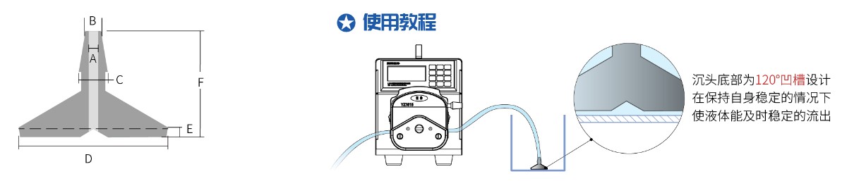 ◆ 軟管下沉作用。配合蠕動泵使用,作為蠕動泵外接管的外接接頭,防軟管漂浮扭動、液體濺出